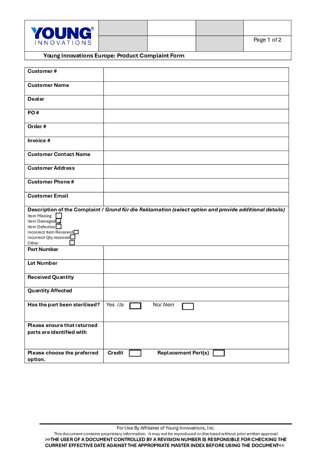 Sollten Sie das PDF-Formular herunterladen, senden Sie dieses bitte ausgefüllte zusammen mit aussagekräftigen Fotos des betroffenen Artikels an folgende E-Mail-Adresse: complaintseurope@younginnovations.com